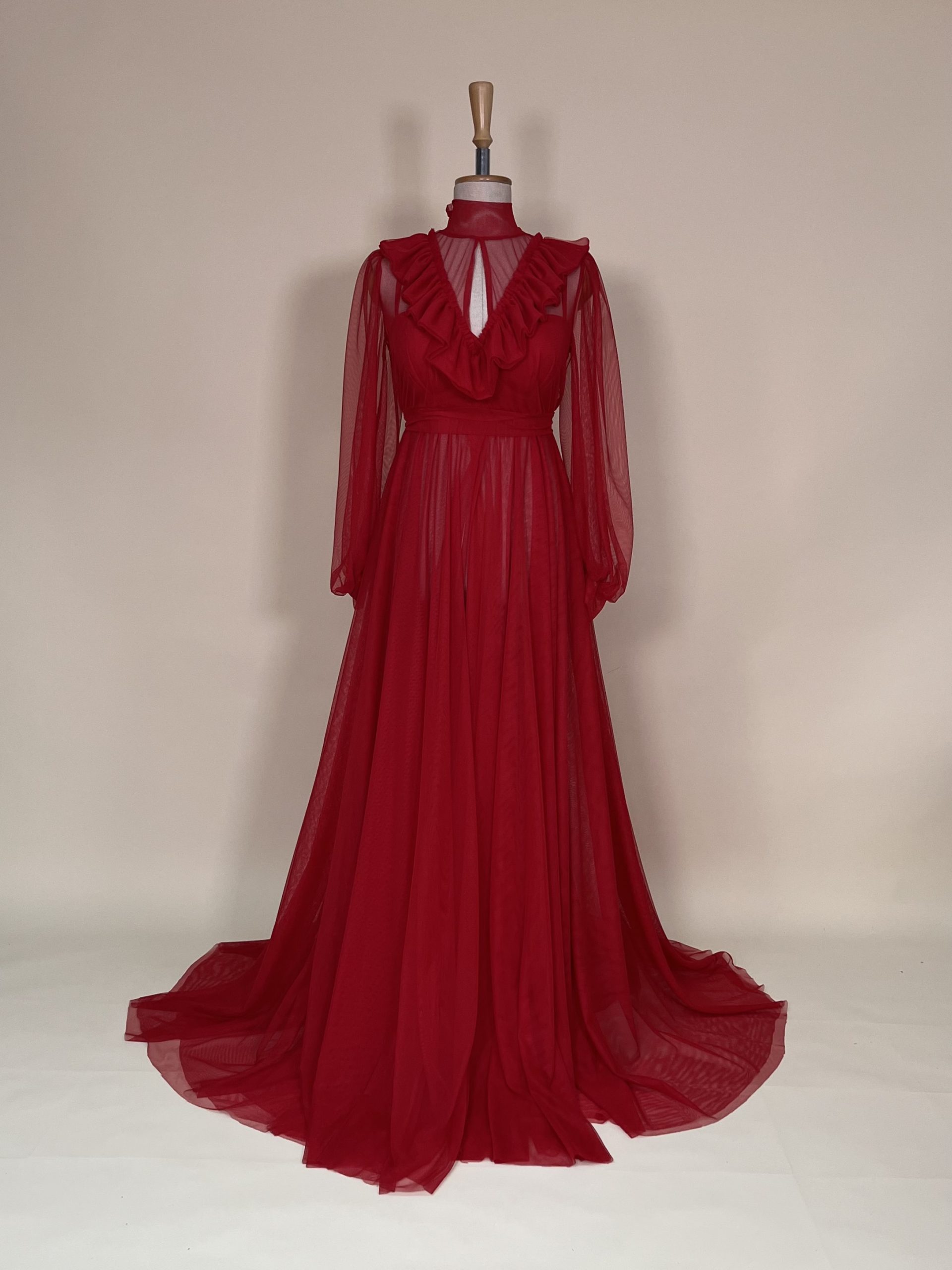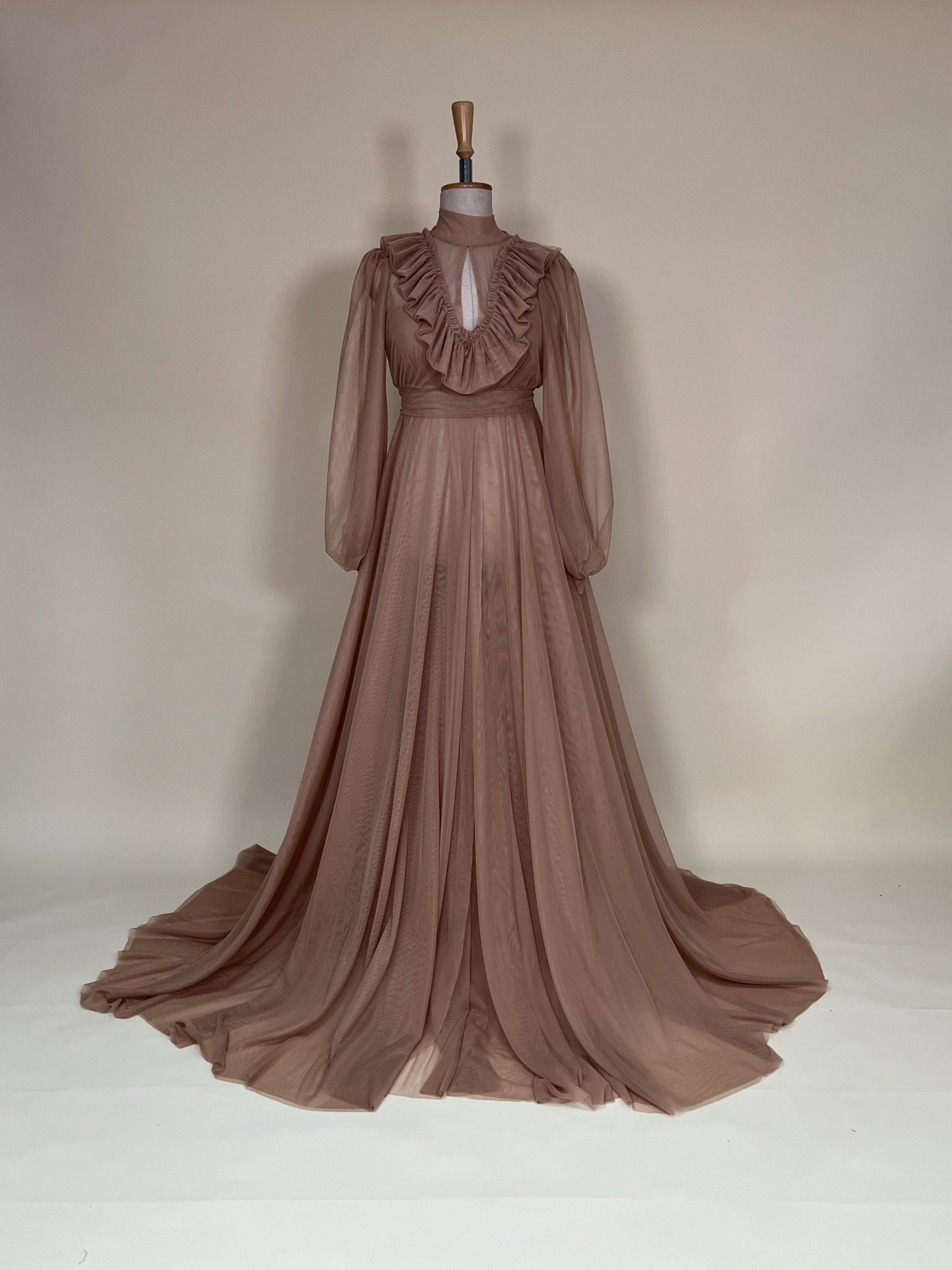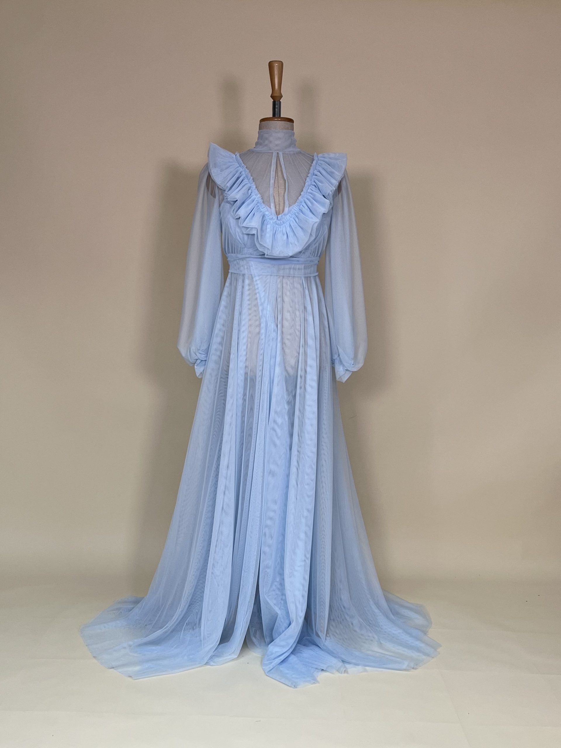 Zestaw składający się z tiulowego gorsetu z dopinaną falbaną, tiulowej bluzeczki z długim rękawem, tiulowych rękawków z bufką, tiulowej szerokiej spódnicy i wąskiej spódnicy z jerseyu
