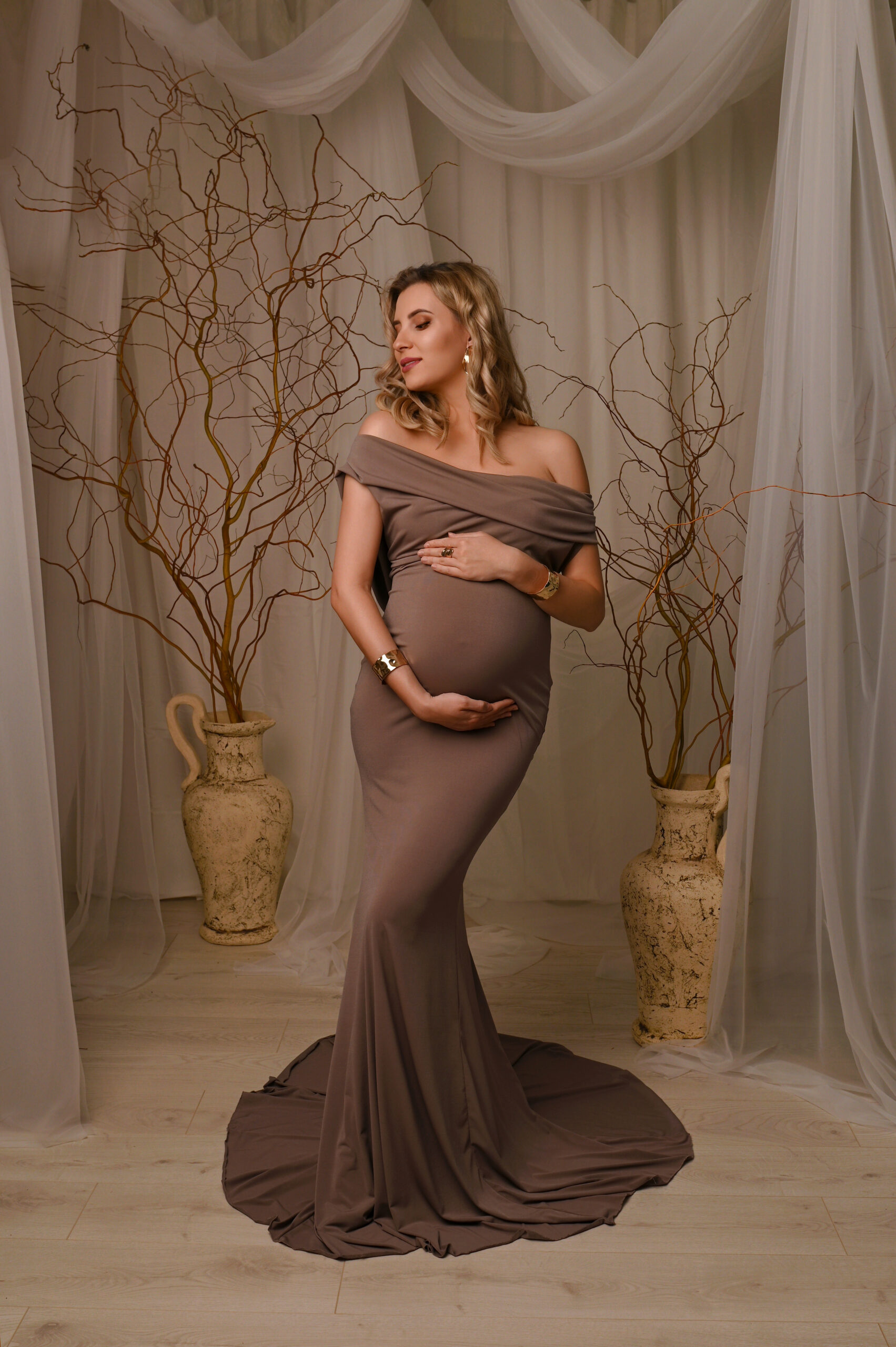 Zmysłowa suknia wykonana z elastycznego jerseyu. Miękko układający się kaptur, głęboki dekolt oraz odsłonięte plecy. Tył sukni delikatnie wydłużony w lekki tren.