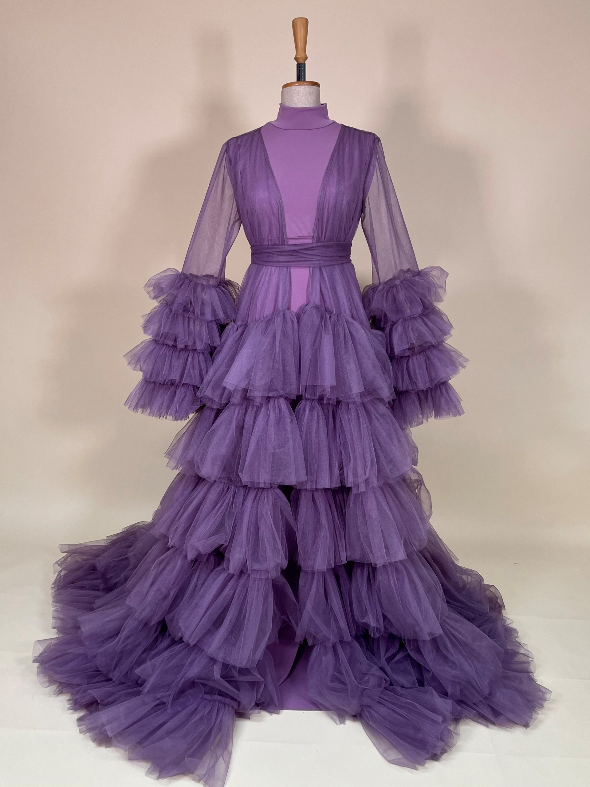 Bogato zdobiona falbanami tiulowa suknia w formie peniuaru. Dół sukni oraz dół rękawa sukni wykończony falbanami z puszystego tiulu. W zestawie dobrane kolorystycznie body, wąska spódnica jersejowa oraz top z golfem .