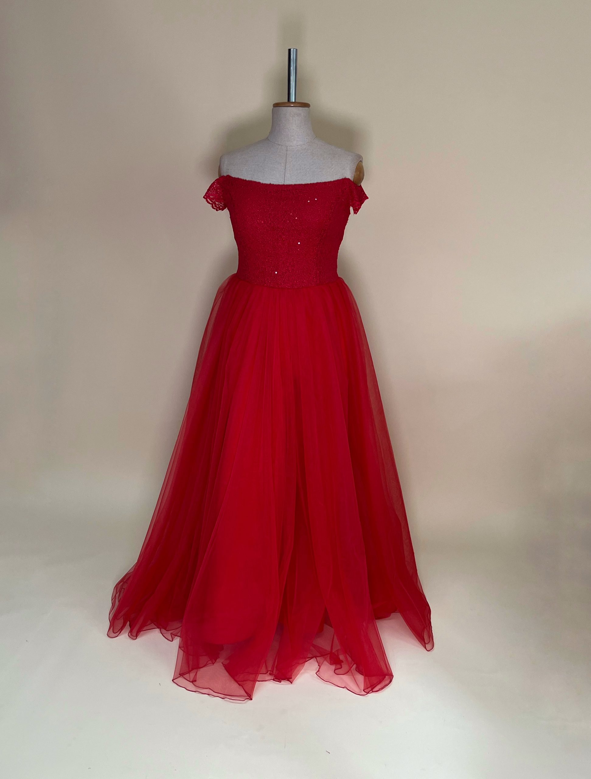 Długa suknia na miękkim gorsecie stworzona z myślą o wyjątkowych okazjach. Dwie warstwy delikatnego tiulu z pełnego koła tworzą efektowny , lekko unoszący się dół. Góra uszyta z elastycznej, delikatnej koronki podszytej jerseyem, co zapewnia komfort noszenia. Ozdobne opadające rękawki dodają uroku, a praktyczny zamek z tyłu i wszyte pętelki ze sznurowaniem umożliwiają dopasowanie sukienki.