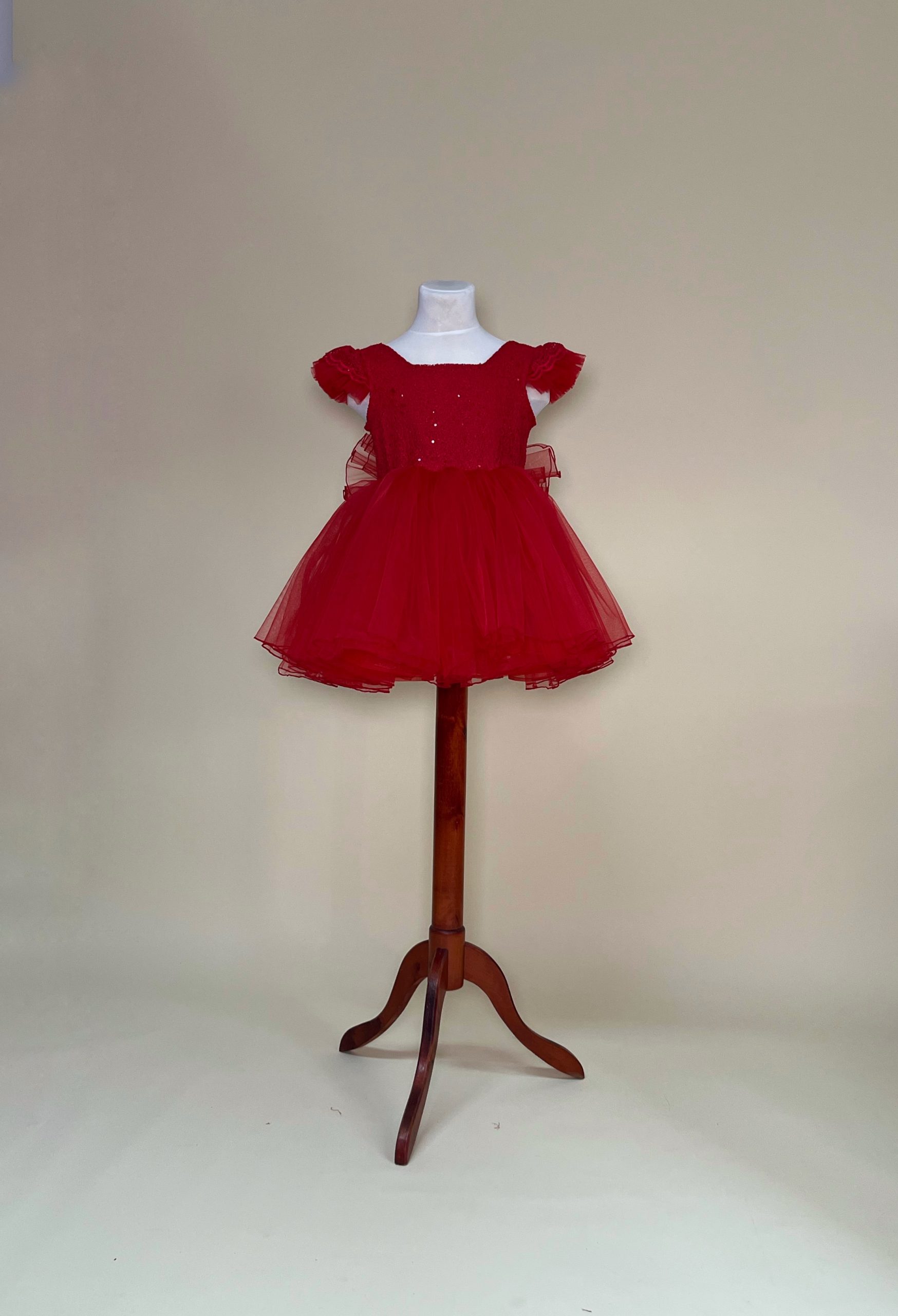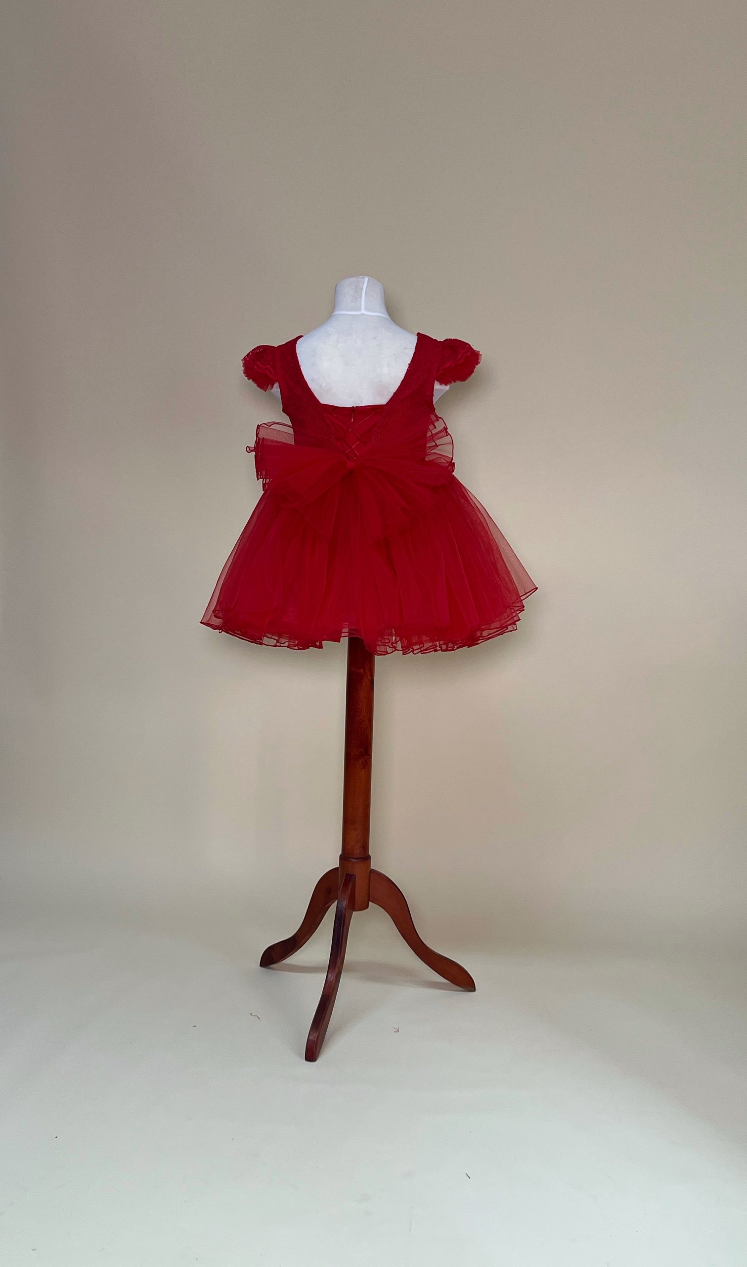 Puszysta krótka sukienka stworzona z myślą o wyjątkowych okazjach. Trzy warstwy delikatnego tiulu tworzą efektowny , lekko unoszący się dół. Góra uszyta z elastycznej, delikatnej koronki podszytej jerseyem, co zapewnia komfort noszenia. Ozdobne rękawki dodają uroku, a praktyczny zamek z tyłu i wszyte pętelki ze sznurowaniem umożliwiają dopasowanie sukienki. Z tylu dopinana ozdobna kokarda.