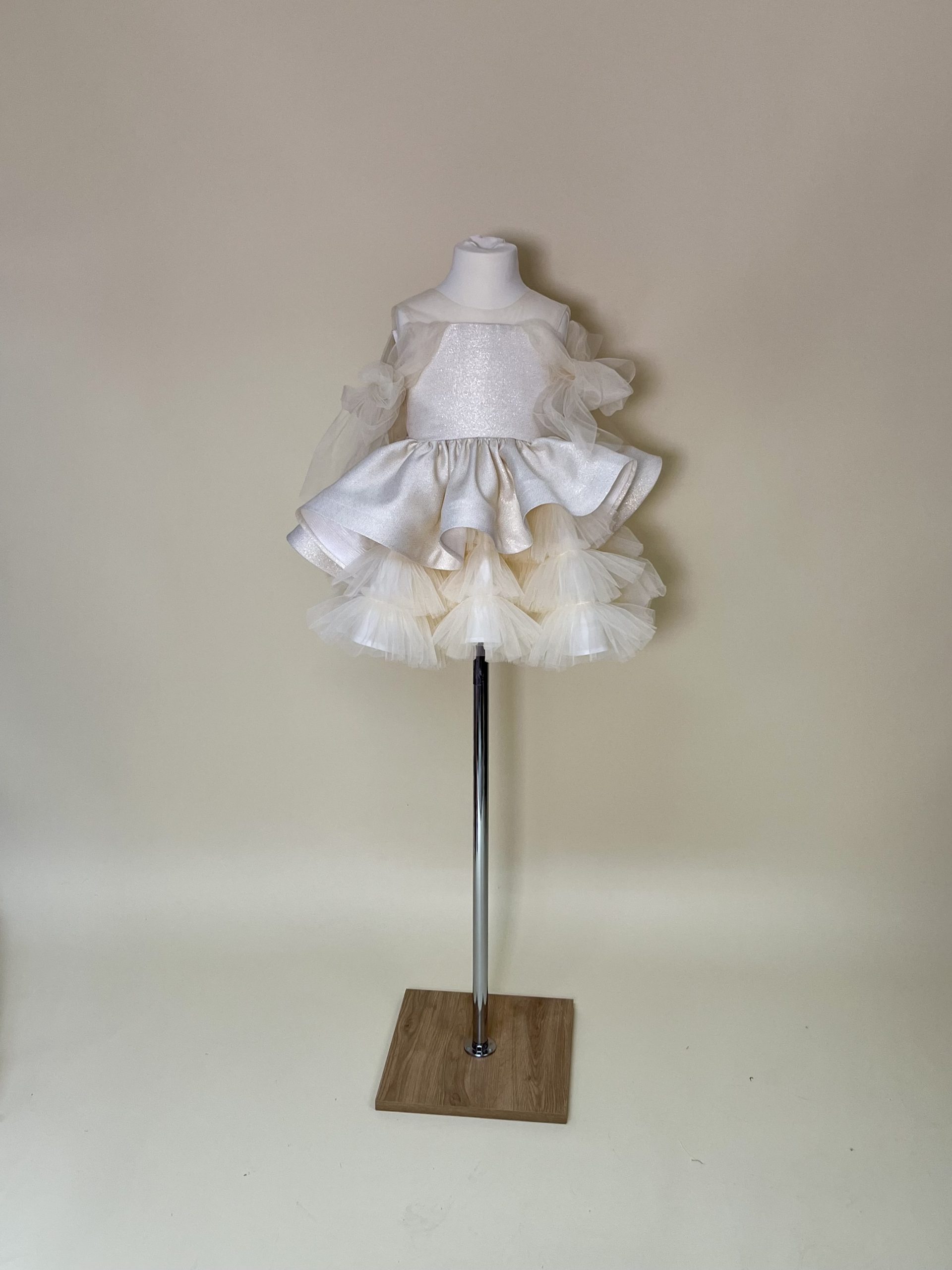 Góra uszyta z materiału ze złotą nitką subtelnie połyskuje w świetle, a tiulowy, opadający rękawek z uroczą kokardką dodaje lekkości i bajkowego charakteru. Dół sukienki zdobią efektowne, tiulowe falbany